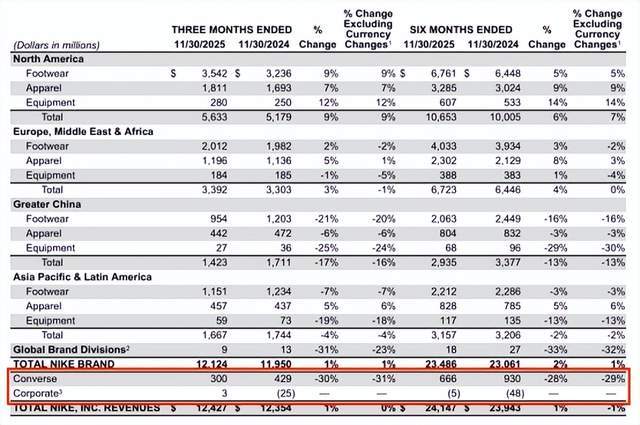 在2026财年第一季度,匡威收入同比下降27%至3.66亿美元,下滑“来自所有地区”;第二季度,匡威收入同比下降30%。连续两个季度的暴跌,使该分析师认为,匡威的“潜在健康状况”比最初认为的“更加岌岌可危”。