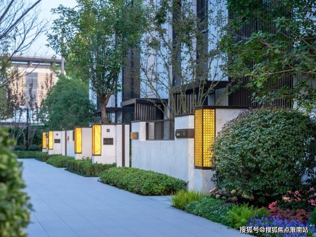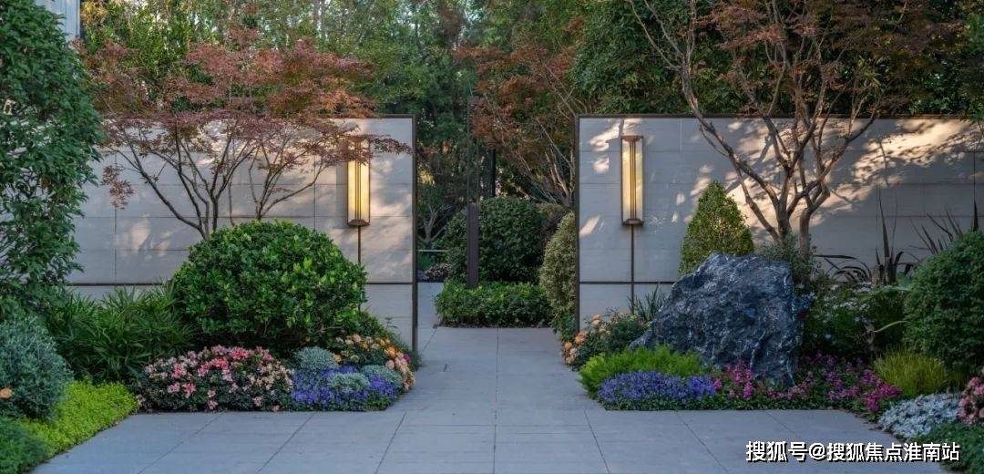 选用温润典雅的天然石材作为基底,中轴对称式布局彰显高门气魄,水景内涌泉汨汨且搭配泛星灯光,转角处的精美艺术景墙,为业主营造更具仪式感和尊贵感的归家体验。