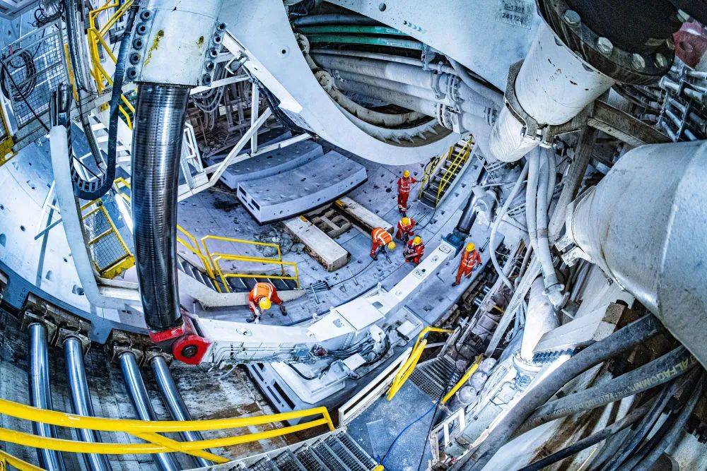在济南市黄岗路黄河隧道盾构作业现场,建设者对拼装好的管片进行加固。(受访单位供图)
