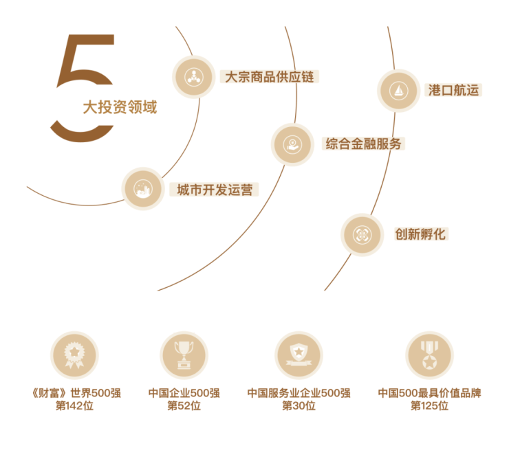 业务涵盖大宗商品供应链、城市开发运营、综合金融服务、港口航运、创新孵化,致力于成为具有全球竞争力的综合性投资控股集团。