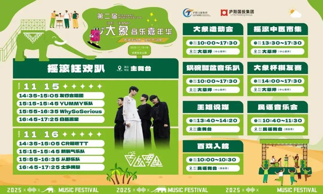 本次活动将汇聚8支乐队,分为主舞台和民谣舞台,同时还有大象运动会、摇滚中医市集等精彩内容。