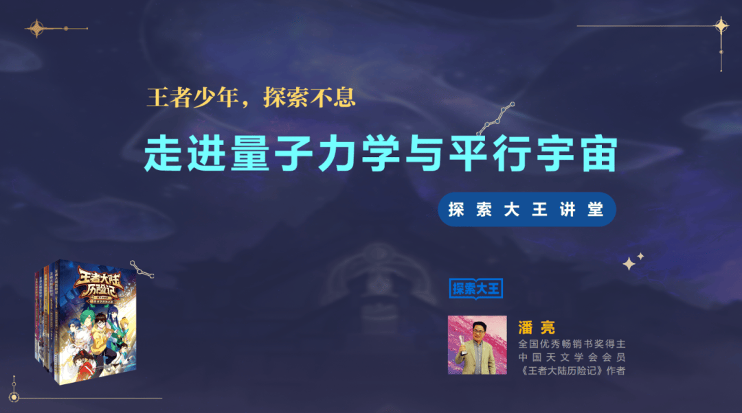 “百位名家进滁图”系列品牌讲座:“王者少年,探索不息——走进量子力学与平行宇宙”探索大王讲堂本次活动,潘亮老师将带领孩子们一起探索故事创作的奥秘,走进量子力学与平行宇宙,激发无限想象力。现场互动环节,幸运小朋友将有机会获得精美主题礼品,把阅读的快乐带回家!