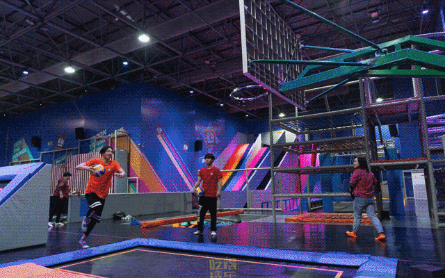 这个泡泡球场周围都是小格子的蹦床,别忘记可以借助蹦床的力量弹起来,让你的全身都动起来。