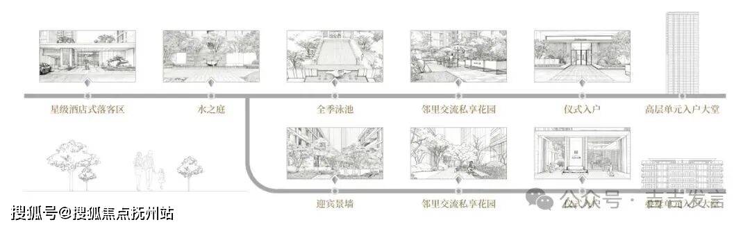 以“顶级酒店入口仪仗”为蓝本,叠加东方“松石水韵”意境。约60米舒展形象展示面营造“步入即显贵”的仪式感;约30米艺术豪奢定制门厅,弱化传统社区门庭的阻隔感,强化尊崇迎宾感。