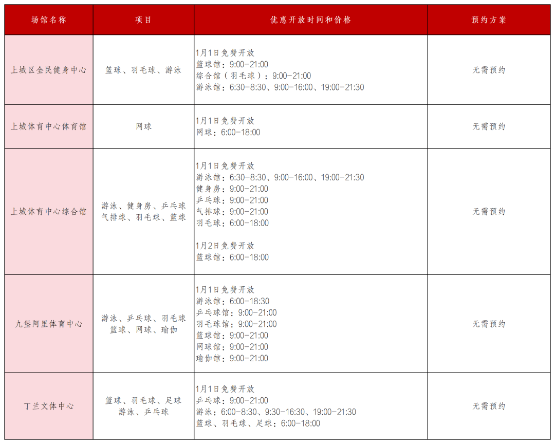 5个体育场馆向大众惠民开放。开放项目包含篮球、羽毛球、乒乓球、健身、游泳、足球、网球等。