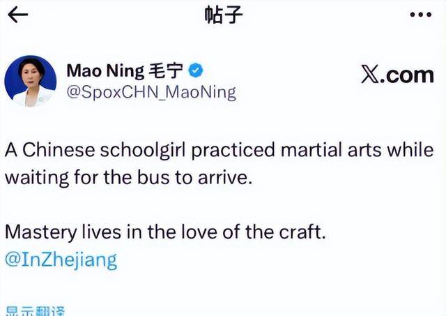 12月25日,外交部发言人毛宁在海外社交账号上,转发了这段视频,还配了文字:“一名中国女学生在等公交车时练习武术,精湛源于对技艺的热爱。”