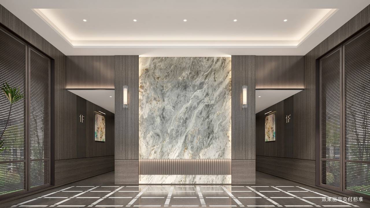 以对仗方正线面独特设计,“冕旒”屋顶,勾勒东方美学立面;石材铝板为材,融入东方元素,彰显门厅精致大气;迎面采用珍石,提供星级大堂的入户体验。
