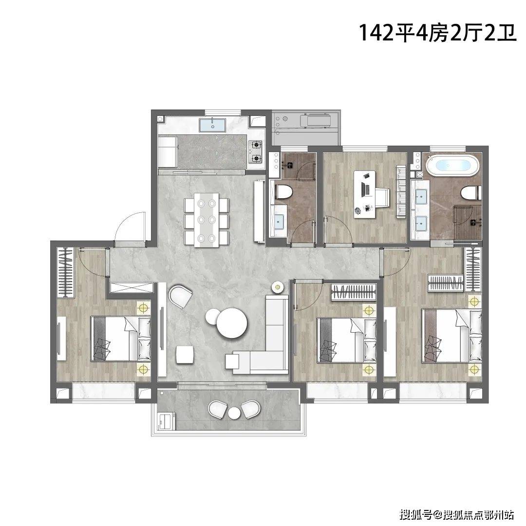 建面约142㎡4室2厅2卫户型,2梯2户设计,大大提升了入户尊贵感和私密性。