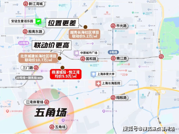 去年二批次土拍杨浦长海地块,联动价大涨!联动价突破了10W+,来到了10.7万/m²!比南侧400米的杨浦城投·悦江湾贵了8000元/㎡!中环旁双轨交+新江湾+五角场的【杨浦城投·悦江湾】成最大赢家!
