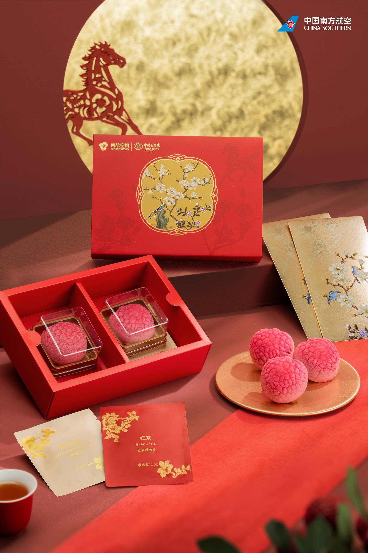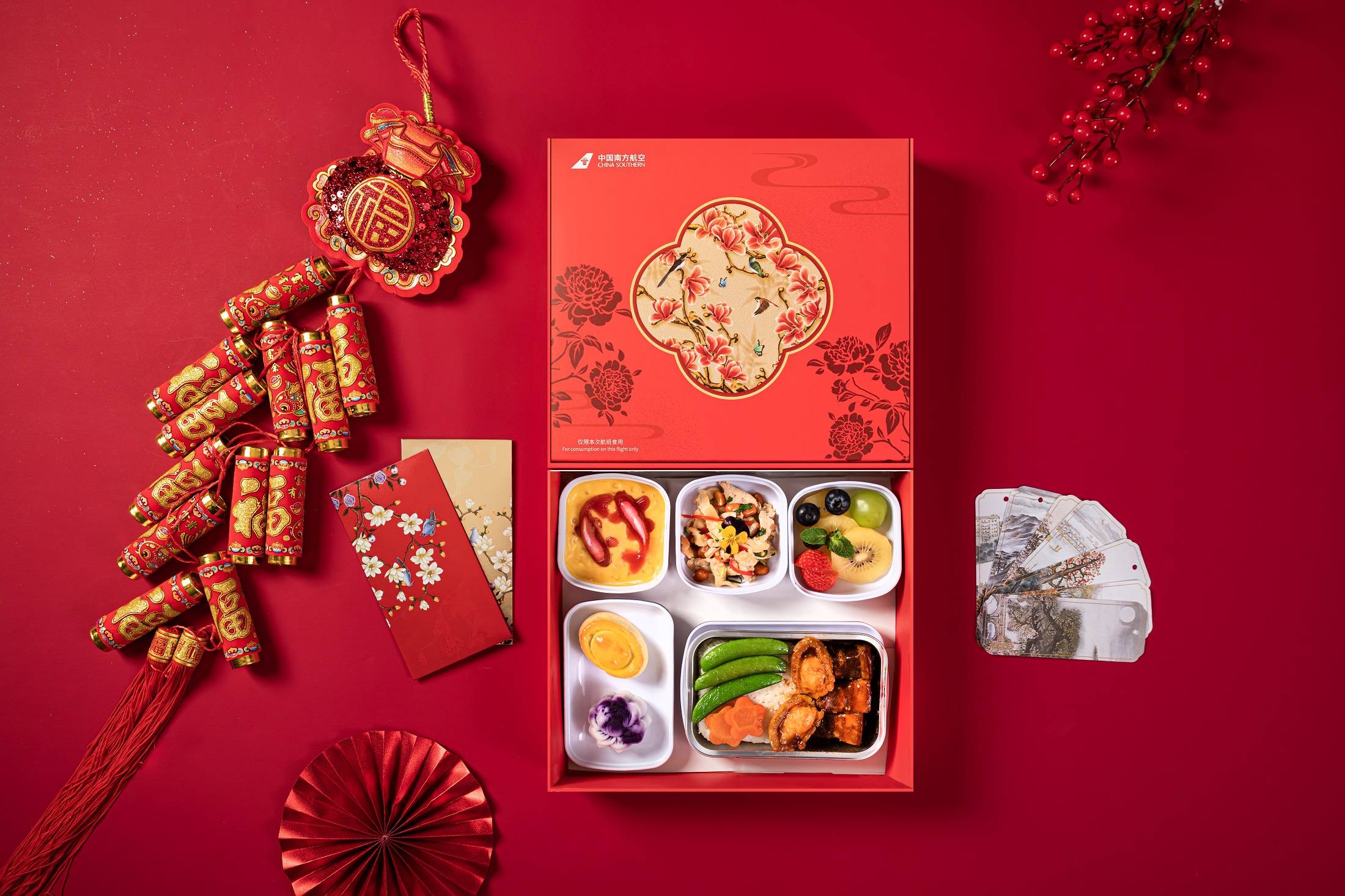 乘坐南航广州始发明珠经济舱及经济舱正餐航班的旅客,可通过南航App提前24小时预订新春特色餐食。主菜鲍鱼红烧肉寓意“金玉满堂”,冷荤“瑞彩捞鸡”取意“捞起捞起,风生水起”,搭配双福贺喜元宝红豆酥与紫薯山药糕两款粤式茶点,让旅客在云端也能品味“舌尖上的年味”。