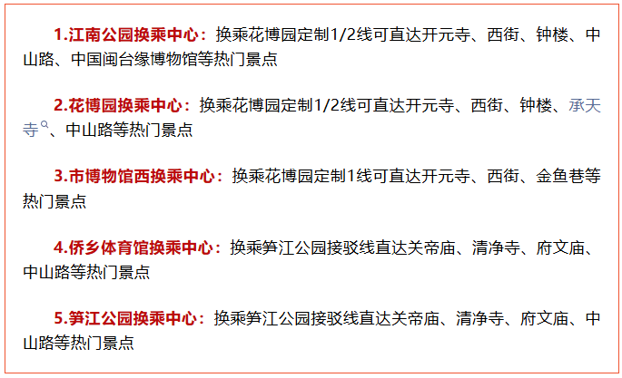 往(返):花博园游客集散中心-茂福路-F1辅道-环清路-北清路(闽台缘博物馆)-新华北路(博物馆西换乘中心、邮电公寓西湖公园、开元寺西门中闽百汇集散中心)-新华南路(芳草园)-江滨北路-田安大桥-江滨南路-江南公园换乘中心