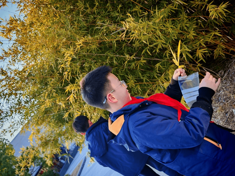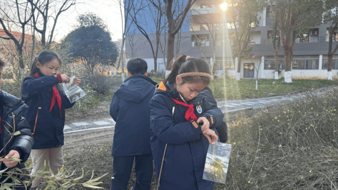 离开喧嚣的赛场,队员们化身“植物观察员,步入如诗如画的校园生态区。南大的植物种类繁多,即使在初春,依然生机盎然。队员们手持植物观察学习单,穿梭在林荫道与灌木丛间,仔细辨认着常绿植物与落叶植物的区别。大家俯身观察松针的簇生、梅花的含苞,并认真记录下校园植被的生长习性。这种沉浸式的科学探索,不仅丰富了大家的自然知识,更让红领巾们在亲近自然的过程中,增强了保护生态、共建绿色家园的责任感。